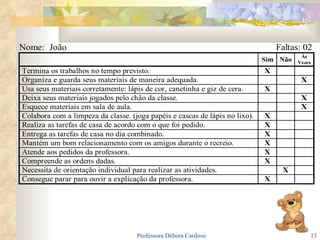 O documento discute a avaliação contínua na educação infantil. Apresenta os tipos de avaliação frequentemente utilizados como avaliação classificatória e avaliação mediadora. Inclui um relatório individual de um aluno do 3o trimestre com observações do professor e comentários dos pais, além de sugestões de roteiro para registro da avaliação.