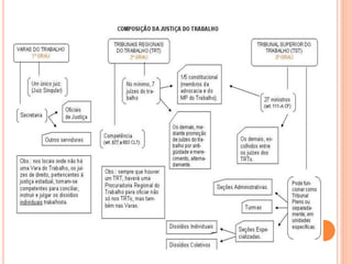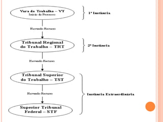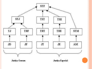 O documento descreve a organização do poder judiciário no Brasil, dividindo-o em suas instâncias federal, estadual e especializada. Apresenta os principais órgãos do poder judiciário como o Supremo Tribunal Federal, Superior Tribunal de Justiça, Tribunais Regionais Federais, Tribunais Estaduais e especializados.