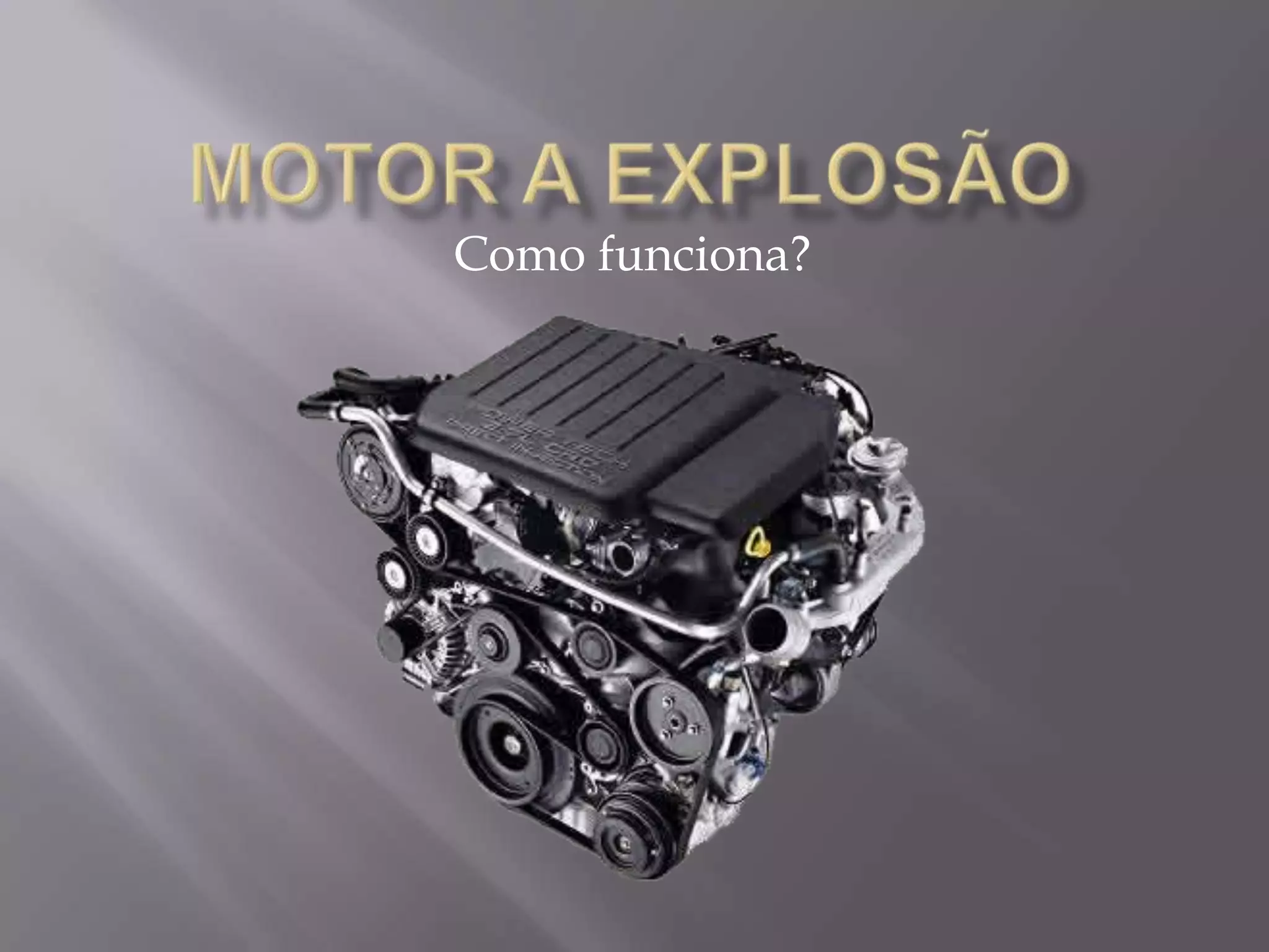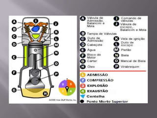 O documento descreve como funciona o motor a explosão em três etapas: 1) O propósito do motor é transformar combustível em movimento através da queima controlada de gasolina dentro do motor; 2) Os motores de quatro tempos completam um ciclo a cada duas voltas do eixo, incluindo admissão, compressão, transferência de calor e exaustão; 3) A combustão ocorre em quatro tempos - indução, compressão, potência e exaustão - usando misturas precisas de ar e combustível.