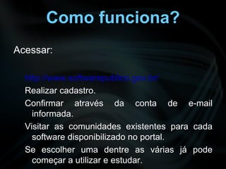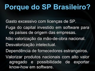 O documento discute o Software Livre (SL) e o Portal do Software Público Brasileiro (PSPB). O SL oferece vantagens sobre o software proprietário, como custo menor e código aberto. O PSPB foi criado pelo governo para compartilhar softwares de interesse público desenvolvidos com SL. Ele disponibiliza diversos programas, como Ginga, e-Cidade e InVesalius.