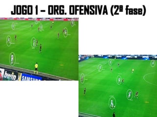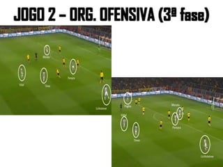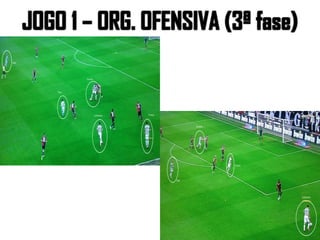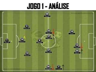 O documento analisa detalhadamente duas partidas da Juventus, destacando a formação tática, estatísticas e estratégias de jogo. A equipe apresenta um sistema 3x5x2 na primeira partida, enfatizando a mobilidade e transições rápidas, enquanto na segunda adota um 4x3x1x2 focado em pressão alta e jogo vertical. Os jogadores-chave como Tévez e Marchisio desempenham papéis cruciais na organização ofensiva e defensiva da equipe.
