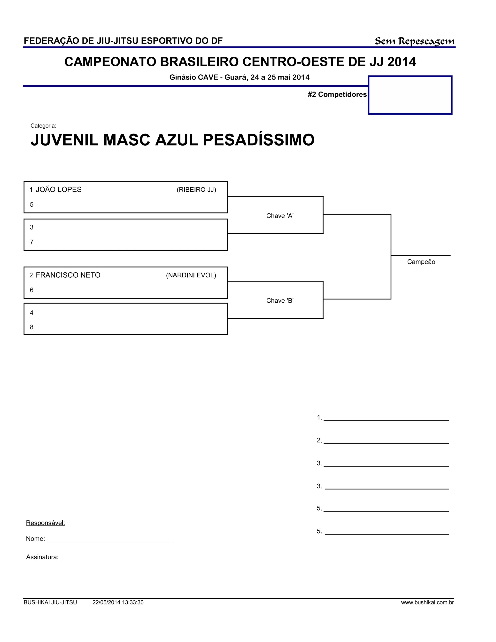 O documento descreve um campeonato de jiu-jitsu realizado em Guará em maio de 2014, com competidores na categoria juvenil masculina azul pesadíssimo. João Lopes da equipe Ribeiro JJ foi o campeão sem passar por repescagem, enquanto Francisco Neto da equipe Nardini Evol terminou em segundo lugar.