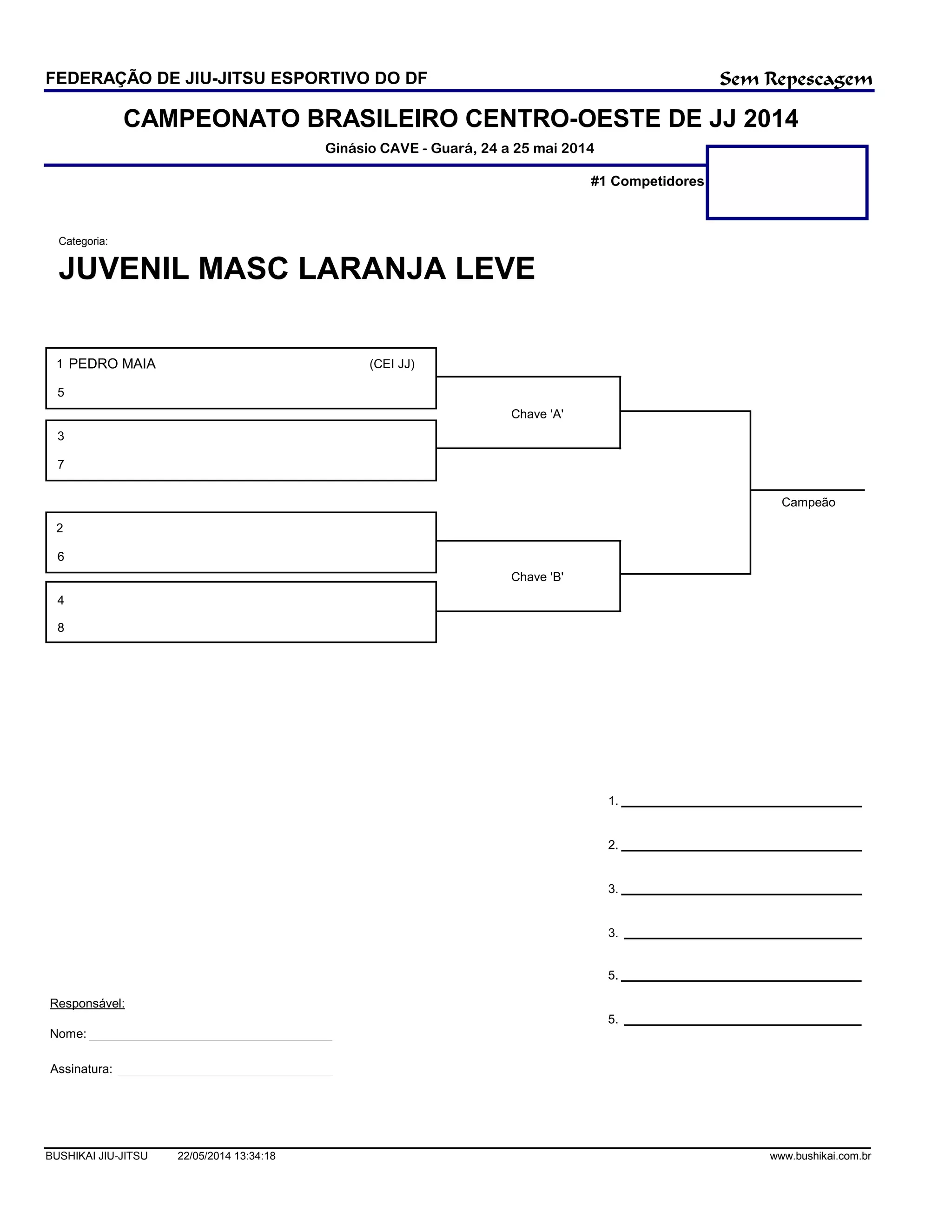 O documento descreve um campeonato de jiu-jitsu realizado em Guará em maio de 2014, com competidores na categoria juvenil masculina laranja leve. O campeão foi Pedro Maia do CEI JJ, que venceu em uma chave sem repescagem. O responsável pelo campeonato assinou o documento confirmando os resultados da competição.