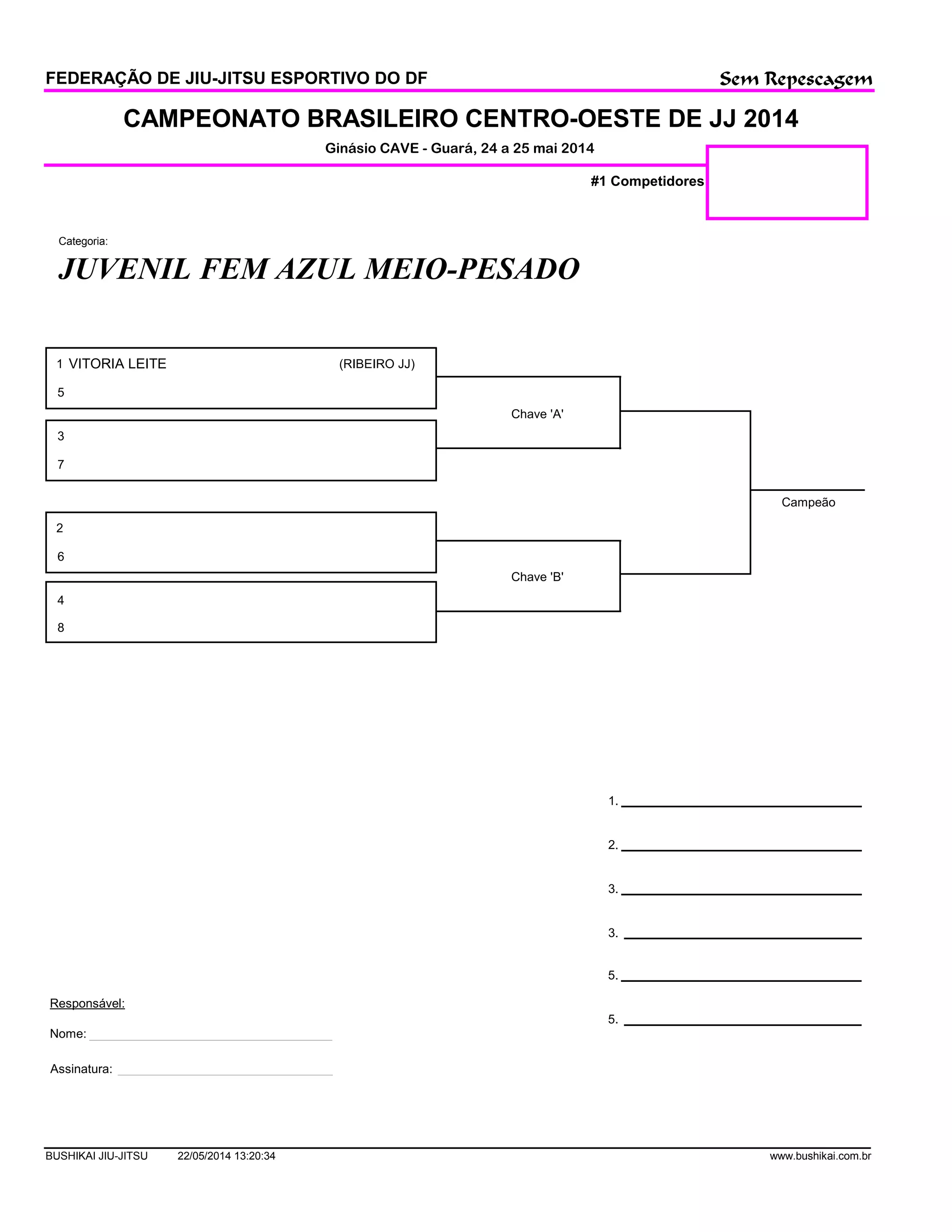 O documento descreve um campeonato de jiu-jitsu realizado em Guará em maio de 2014, com competidores na categoria juvenil feminina azul meio-pesado. Vitoria Leite do Ribeirão JJ foi a campeã após vencer as chaves A e B da competição, que não teve fase de repescagem.