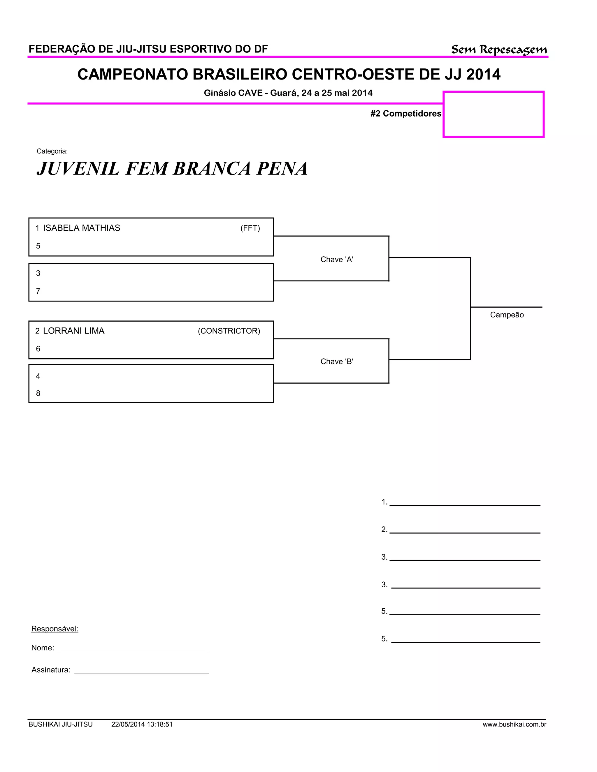 O Campeonato Brasileiro Centro-Oeste de Jiu-Jitsu 2014 foi realizado nos dias 24 e 25 de maio no Ginásio CAVE em Guará. A categoria Juvenil Feminina Branca Pena teve 2 competidoras, Isabela Mathias da FFT e Lorrani Lima do Constrictor, sem fase de repescagem. Isabela Mathias foi a campeã da categoria.