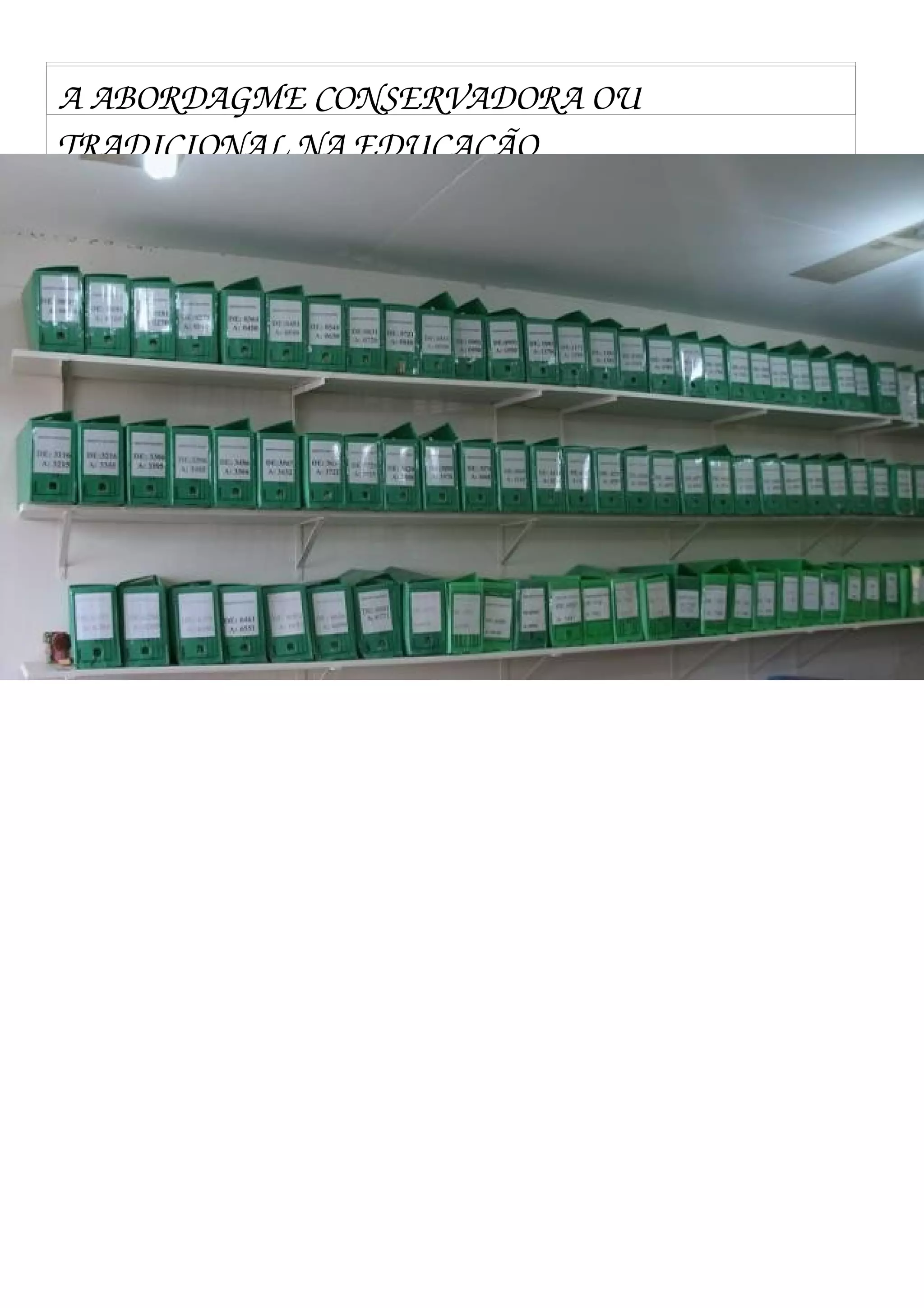 O documento discute a abordagem conservadora ou tradicional na educação, mas não fornece detalhes sobre suas características ou princípios. Infelizmente, sem mais informações no texto, não é possível resumir adequadamente os pontos-chave.