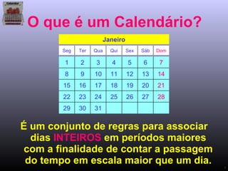 1) Calendários são conjuntos de regras para associar dias a períodos maiores para contar o tempo em escalas maiores que um dia.