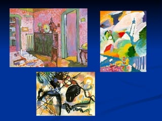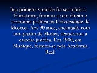 Wassily Kandinsky foi um pintor russo considerado um dos pioneiros da arte abstrata. Inicialmente interessado em música, mudou-se para a pintura influenciado por Monet. Sua obra foi marcada pela sinestesia e cultura camponesa russa. Lecionou na Bauhaus e desenvolveu uma linguagem não-figurativa baseada na música, com formas geométricas e biomórficas.