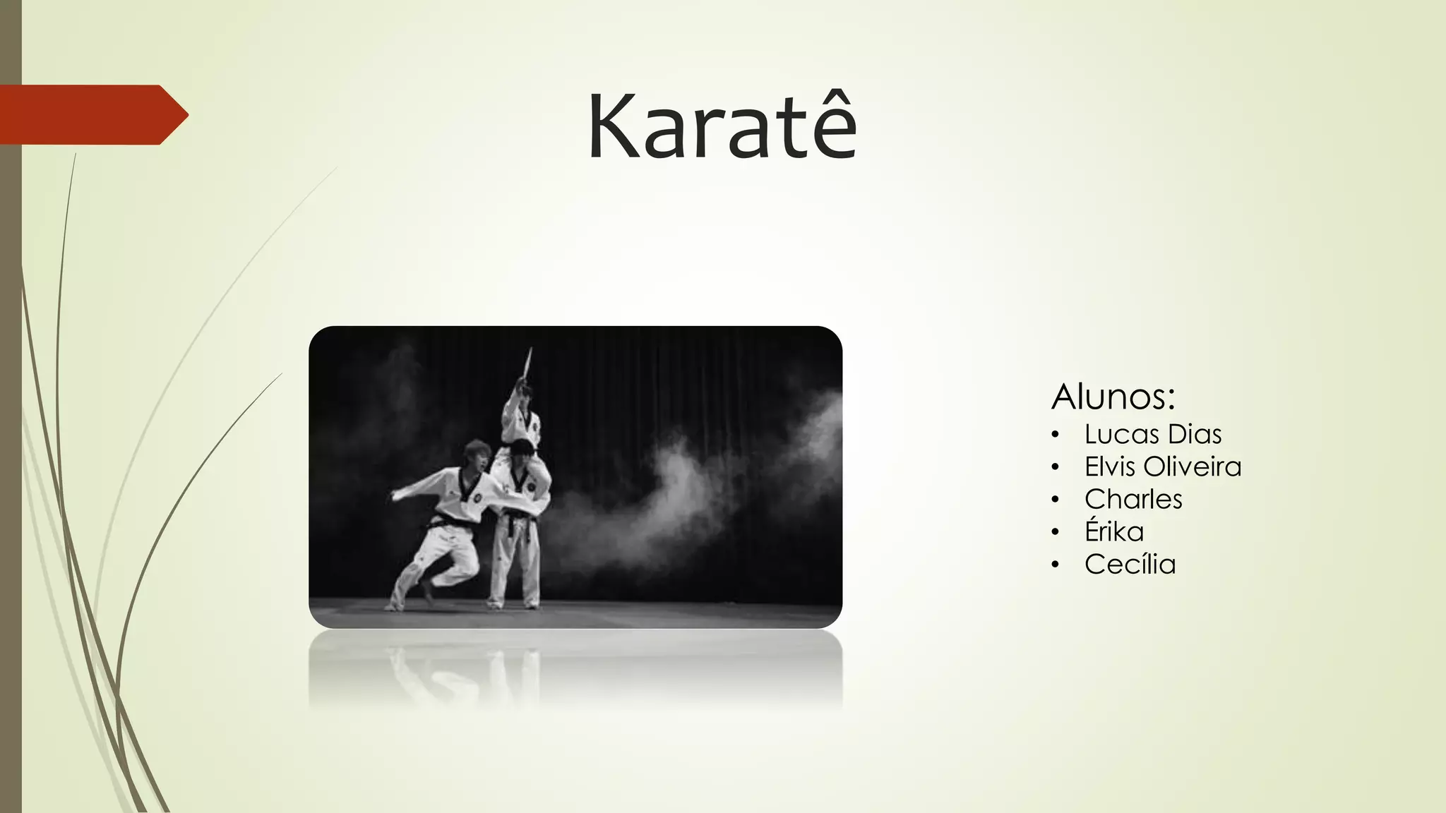 O documento descreve o karatê, arte marcial originada em Okinawa no século 17. Detalha os principais estilos de karatê, como Shotokan, Goju Ryu e Wado Ryu, e seus fundadores. Apresenta também a lista de alunos de karatê: Lucas Dias, Elvis Oliveira, Charles, Érika e Cecília.
