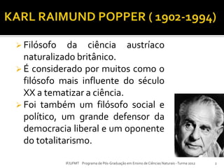 O documento discute a filosofia da ciência de Karl Popper. Segundo Popper, o conhecimento científico não se baseia no método indutivo, mas sim na interação contínua entre conjecturas e refutações. Uma teoria científica é sempre provisória e pode ser refutada a qualquer momento, portanto deve ser passível de teste e refutação.