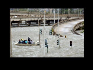 O documento descreve os impactos do furacão Katrina em Nova Orleans, como famílias tiveram que abandonar seus bens para salvar suas vidas. Reflete sobre a fragilidade da vida humana e como eventos como furacões nos lembram da impermanência das coisas materiais. Pede para valorizarmos mais o presente, nos conectarmos mais com os outros e direcionarmos nossos esforços para o que é eterno.