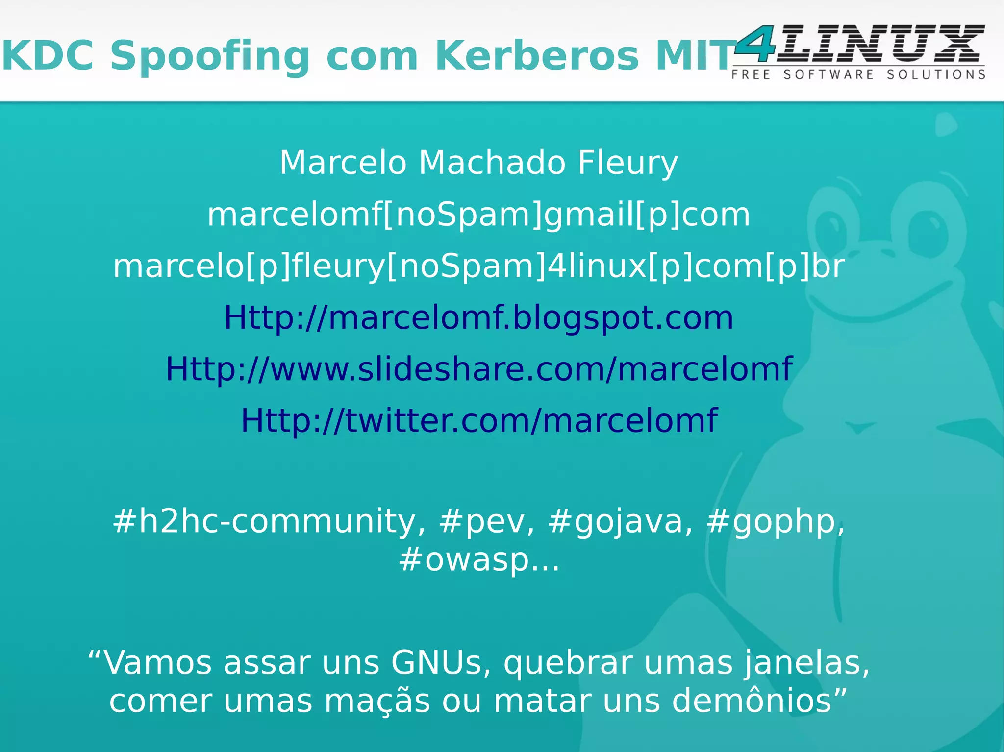 O documento discute spoofing e envenenamento de KDC (Key Distribution Center) no protocolo Kerberos MIT. Apresenta como o KDC spoofing permite realizar ataques de reenvio que comprometem a autenticação e autorização no ambiente Kerberos. Uma demonstração prática é fornecida para ilustrar um ataque de reenvio na autenticação inicial.