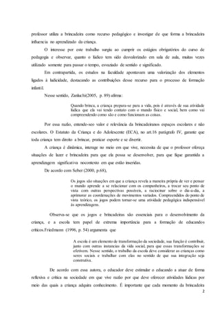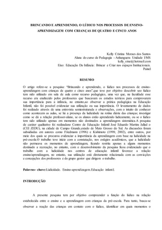 O documento discute a importância do lúdico no processo de ensino-aprendizagem com crianças de 4 e 5 anos. A pesquisa foi realizada em um Centro de Educação Infantil e observou que as crianças aprendem brincando, por exemplo, ao contarem histórias e cantarem músicas. No entanto, a utilização do lúdico depende das concepções dos professores.