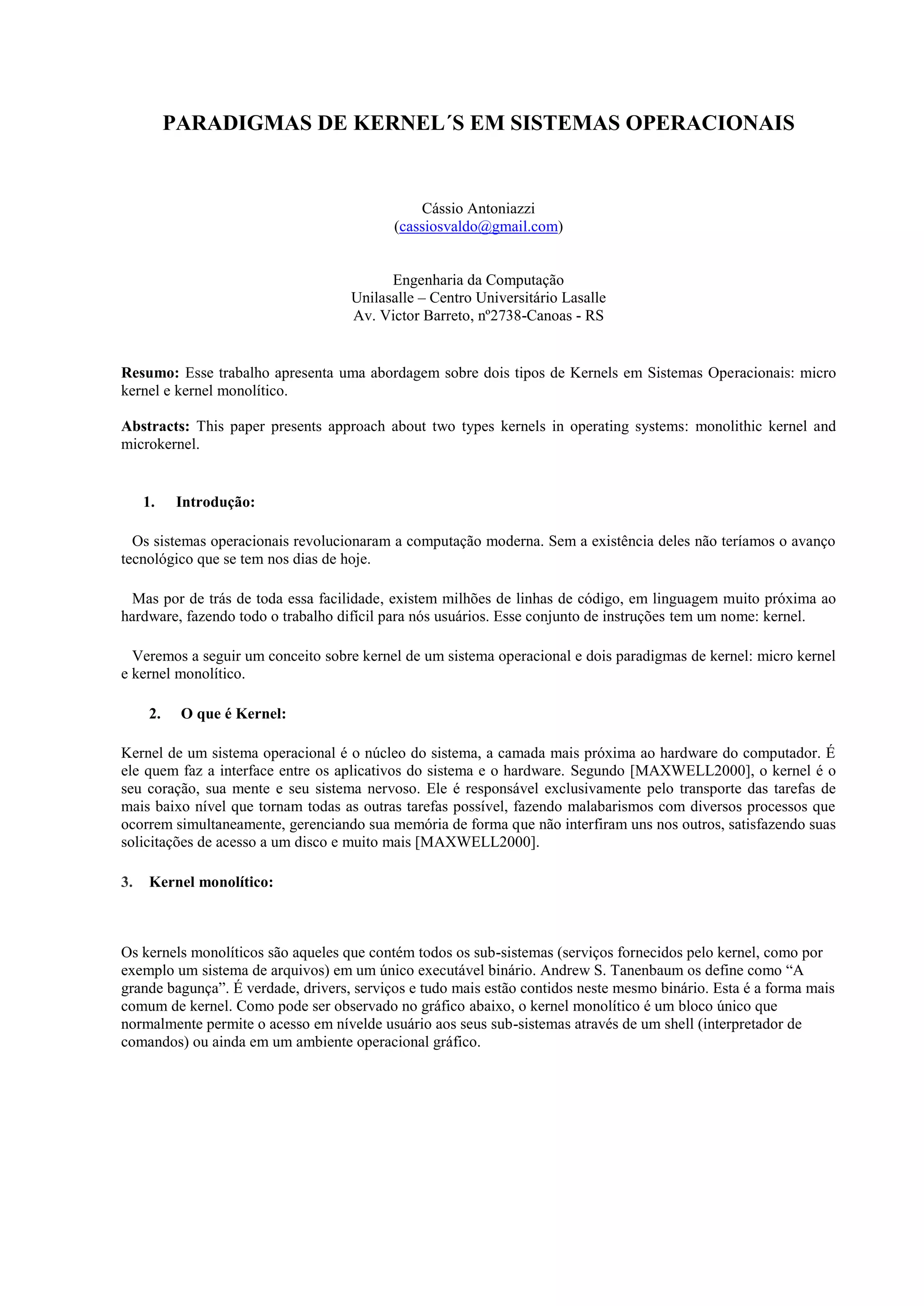 Este documento discute dois paradigmas de kernel em sistemas operacionais: kernel monolítico e microkernel. Um kernel monolítico contém todos os subsistemas em um único executável, enquanto um microkernel oferece apenas funções básicas com outros serviços em camadas acima. Microkernels têm vantagens como flexibilidade e modularidade, mas podem ter desempenho menor. Kernel monolíticos geralmente têm melhor desempenho mas menos segurança e flexibilidade.