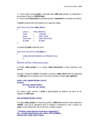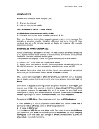 Este documento descreve como criar um driver de dispositivo USB no kernel Linux para controlar displays USB. Ele explica como usar um driver de caracter para enviar e receber caracteres do dispositivo e como usar arquivos no diretório sysfs para permitir que programas no espaço do usuário comuniquem com o driver.