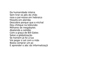 Da humanidade inteiraSem tirar os pés do chão reza o pai-nosso em hebraico filosofa em alemão Descobre porque que o michal Deu chilique na televisão Milhares de megabytes Abatendo a solidão Com a graça de Bill Gates Salve a globolização Se homem já foi a lua Vai pegar o sol com a mão Basta comprar um pc E aprender o abc da informatizaçã