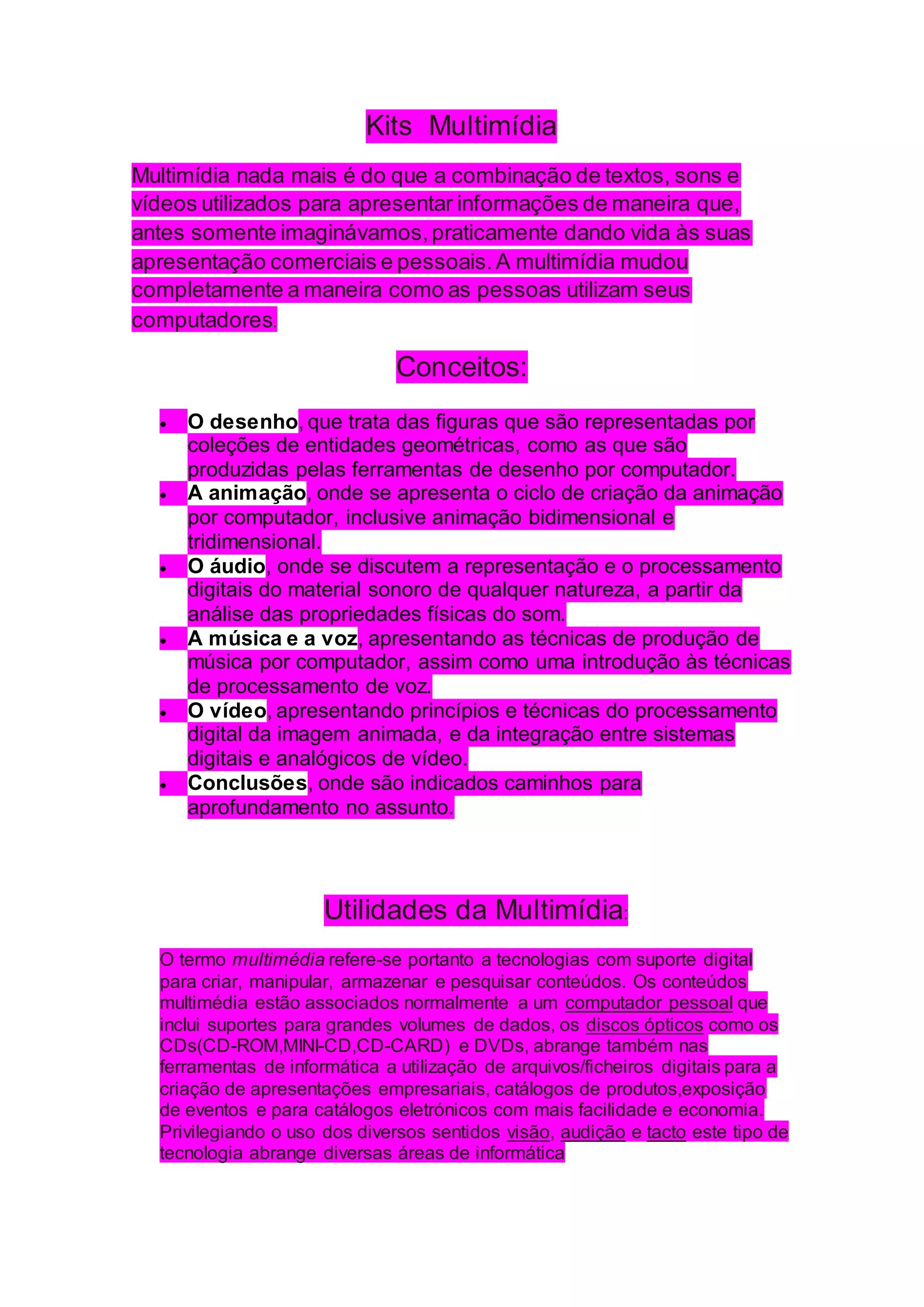 O documento discute o conceito de multimídia, definindo-a como a combinação de texto, som e vídeo para apresentar informações de forma interativa. Ele explica os conceitos de desenho, animação, áudio, música, vídeo e conclusões e descreve as utilidades da multimídia, como a criação de apresentações empresariais e catálogos de produtos de forma econômica e privilegiando a visão, audição e tato.