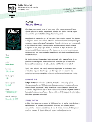 Klaus é a primeira graphic novel do jovem autor Felipe Nunes de 19 anos. A história acompanha o personagem Klaus enquanto ele lida com as dúvidas da adolescência e descobre segredos sobre sua vida. A Balão Editorial publicou a obra de 112 páginas elogiando o estilo enérgico de Felipe Nunes em retratar personagens complexos.