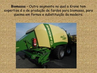 A Krone é uma empresa alemã que fabrica equipamentos para produção de fardos de biomassa para queima em fornos como substituto da madeira. Seu novo modelo BiG Pack High Speed pode enfardar com alta produtividade para produção rural de fardos para o rebanho, oferecendo soluções para enfardar, enleirar e colher silagem.