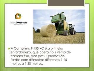 A nova enfardadeira Krone Comprima F 155 XC possui uma câmara de enfardamento semi-variável que pode produzir fardos com diâmetros de 1,25 a 1,50 metros, tornando-a única no mercado. Ela também combina as vantagens dos sistemas de correia e corrente-barramento e inclui até 26 facas para picagem simultânea, permitindo enfardar em diferentes condições.