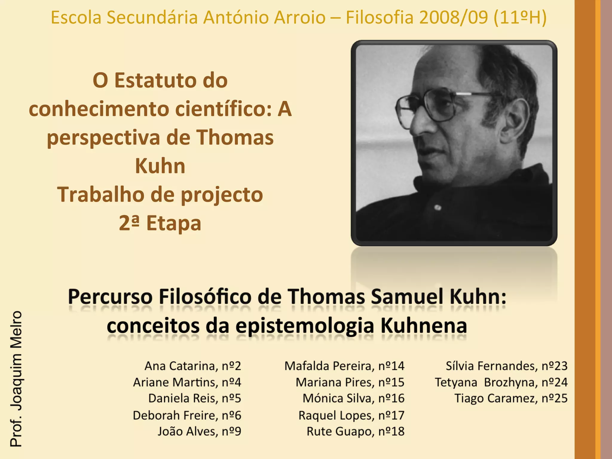 O documento discute a perspectiva de Thomas Kuhn sobre a natureza do conhecimento científico. Segundo Kuhn, a ciência passa por fases de ciência normal, onde um paradigma é aceito, e revoluções científicas, onde um novo paradigma substitui o antigo. Anomalias no paradigma existente podem levar a uma crise e eventualmente a uma revolução científica, na qual um novo paradigma é estabelecido. Paradigmas são incomensuráveis e não há critérios objetivos para compará-los.