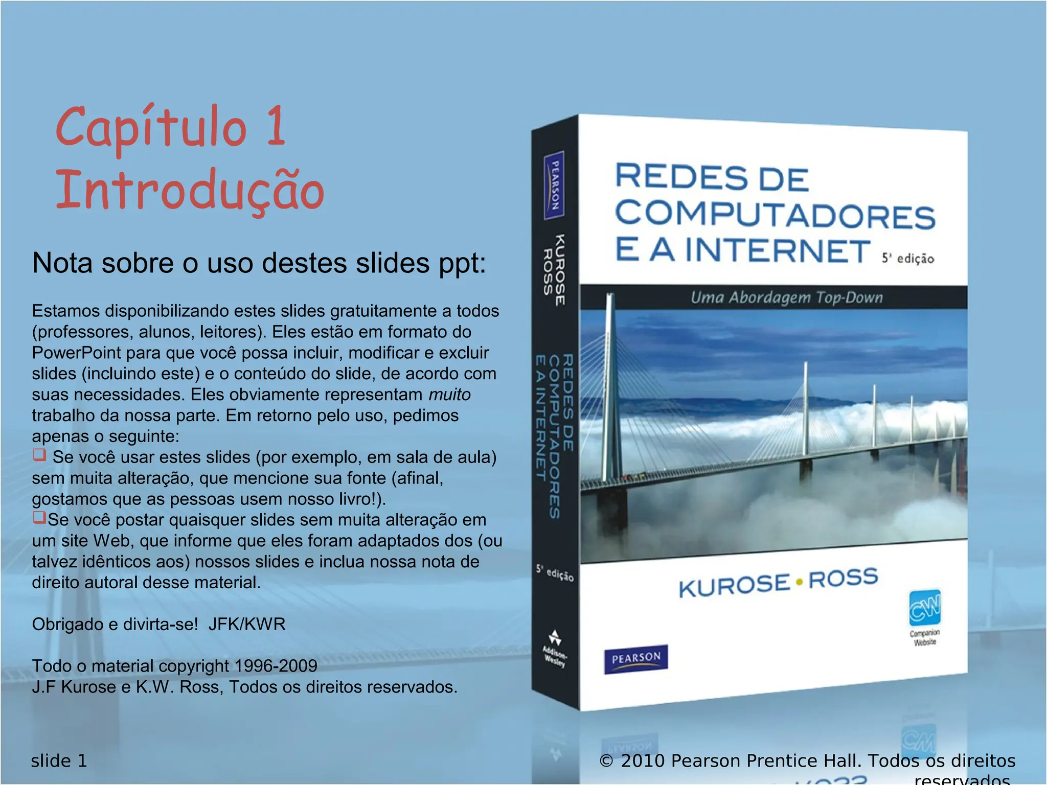 Prentice Hall. Todos os direitos slide 65 Capítulo 1: Roteiro 1.1 O que é a Internet? 1.2 Borda da rede sistemas finais, redes de acesso, enlaces 1.3 Núcleo da rede comutação de circuitos, comutação de pacotes, estrutura da rede 1.4 Atraso, perda e vazão nas redes comutadas por pacotes 1.5 Camadas de protocolo, modelos de serviço 1.6 Redes sob ataque: segurança 1.7 História