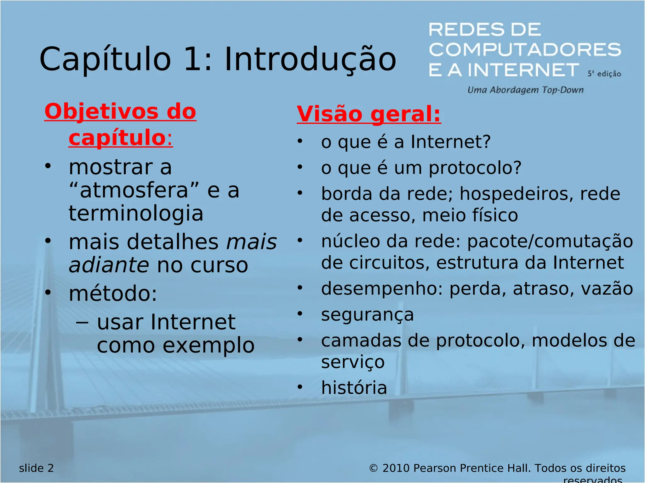 Prentice Hall. Todos os direitos slide 43 Capítulo 1: Roteiro 1.1 O que é a Internet? 1.2 Borda da rede sistemas finais, redes de acesso, enlaces 1.3 Núcleo da rede comutação de circuitos, comutação de pacotes, estrutura da rede 1.4 Atraso, perda e vazão nas redes comutadas por pacotes 1.5 Camadas de protocolo, modelos de serviço 1.6 Redes sob ataque: segurança