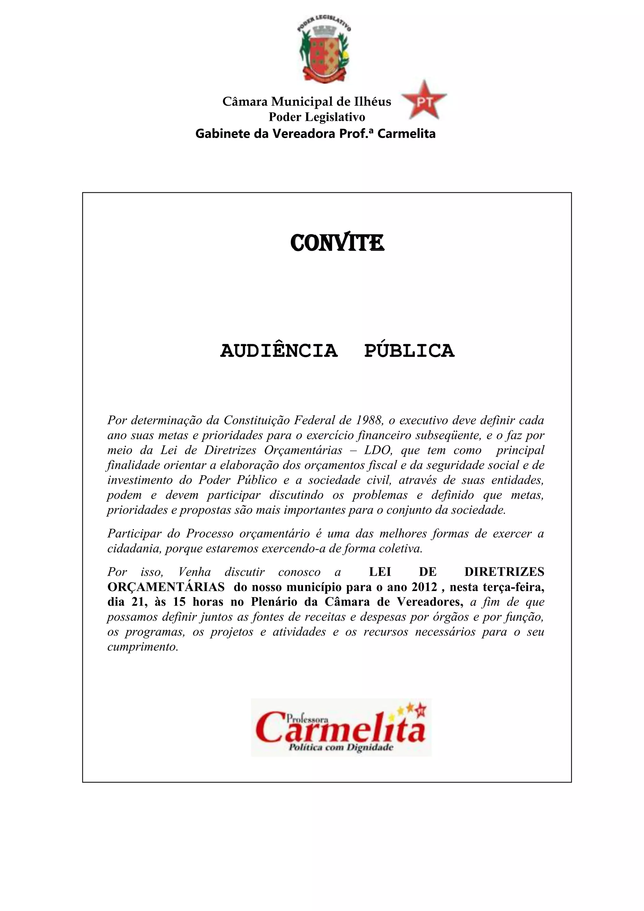 A vereadora Carmelita convida a sociedade civil para uma audiência pública na terça-feira às 15h no plenário da Câmara Municipal de Ilhéus para discutir a Lei de Diretrizes Orçamentárias do município para 2012 e definir prioridades e propostas para o orçamento do ano seguinte.