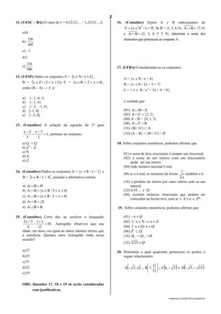 (a) O documento apresenta uma lista de exercícios de matemática com 32 questões sobre conjuntos numéricos, geometria plana e trigonometria. (b) As questões abordam tópicos como interseção e união de conjuntos, coordenadas de pontos no plano cartesiano, simetria, arcos trigonométricos e identidades trigonométricas. (c) Há também exercícios propostos envolvendo funções trigonométricas como seno, cosseno e tangente.
