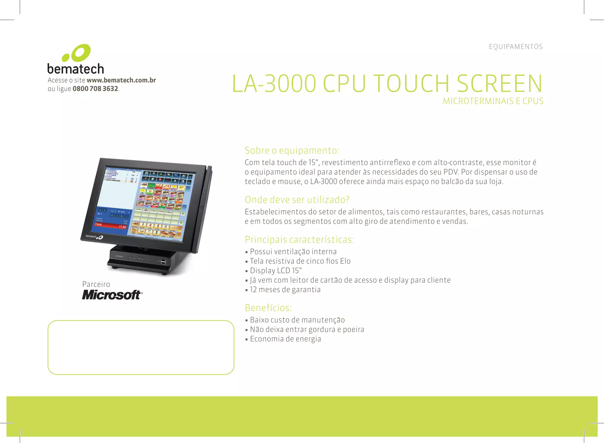 O documento descreve um monitor touchscreen LA-3000 para PDV, destacando suas principais características como tela de 15 polegadas resistente, leitor de cartão e display para cliente, sendo ideal para estabelecimentos com alto fluxo como restaurantes e bares.