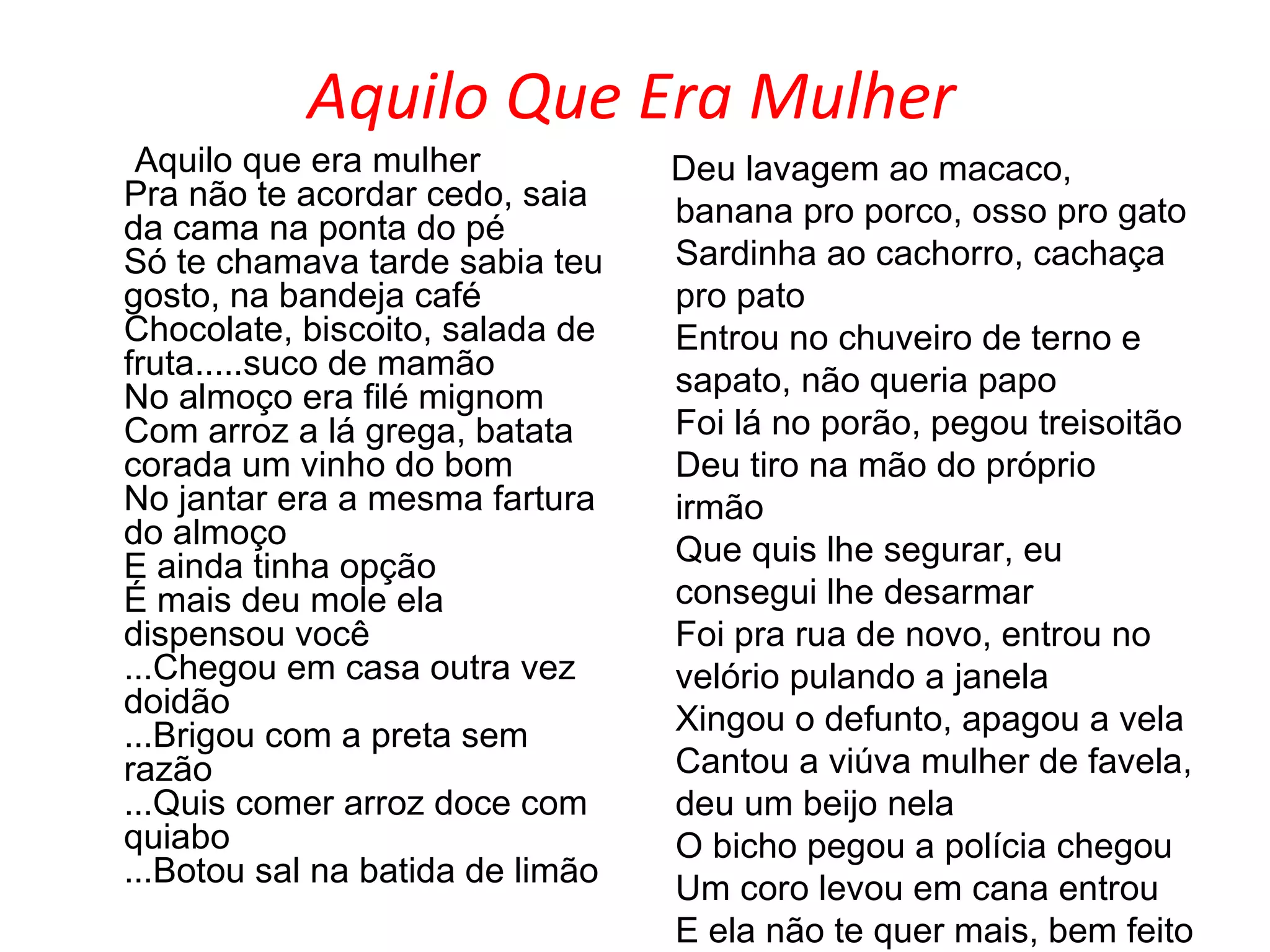 O documento descreve o comportamento errático de uma pessoa após beber excessivamente, incluindo brigar sem motivo, colocar sal em suco de limão e atirar na própria mão. A polícia é chamada e a pessoa é presa. Em contraste, o documento também elogia a simplicidade e compaixão de uma mulher chamada Amélia, descrita como o verdadeiro exemplo de mulher.