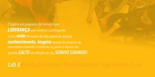 O documento descreve o LabX, um programa de formação em liderança da Fundação Estudar que conecta jovens de alto potencial através de conteúdo inspirador, histórias de convidados e desafios que estimulam os sonhos e a transformação social. O texto detalha o conteúdo, datas e como se inscrever no programa.