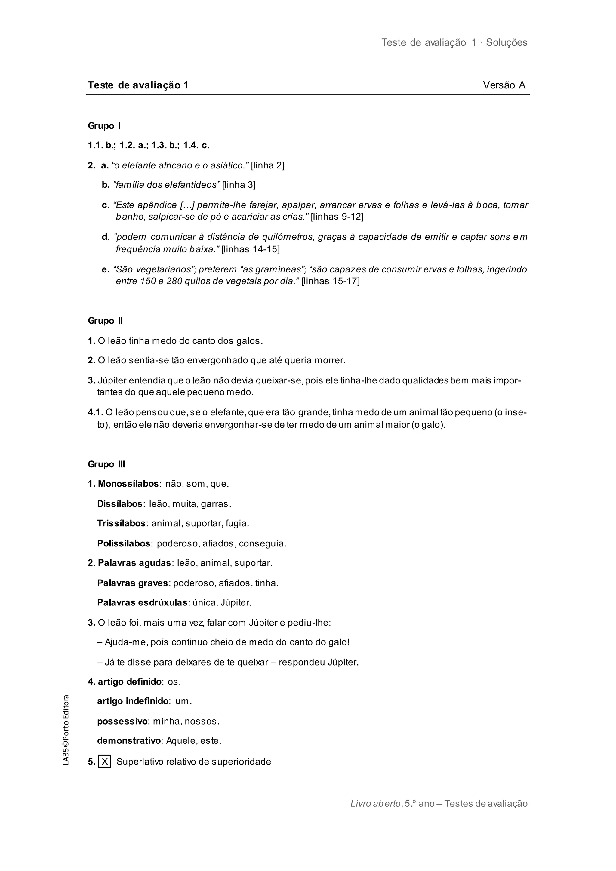 Este documento resume as soluções de um teste de avaliação sobre elefantes e leões. Contém as respostas corretas para várias perguntas sobre elefantes, uma história sobre um leão que tem medo de galos, e exercícios gramaticais sobre palavras monossílabas, tónicas e artigos.