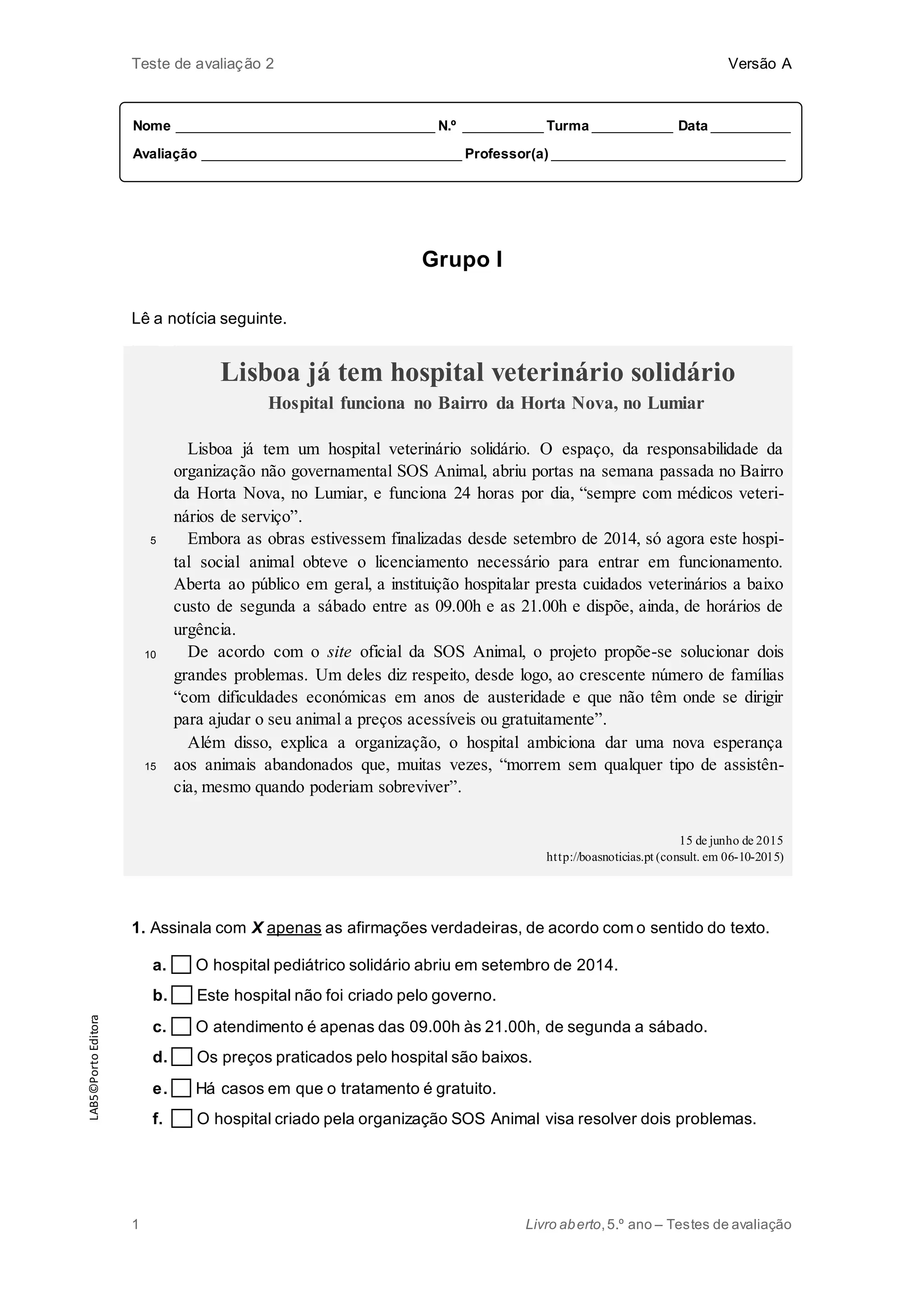 O documento apresenta uma notícia sobre um novo hospital veterinário solidário em Lisboa que presta cuidados a baixo custo e gratuitamente para animais de famílias com dificuldades económicas e animais abandonados.