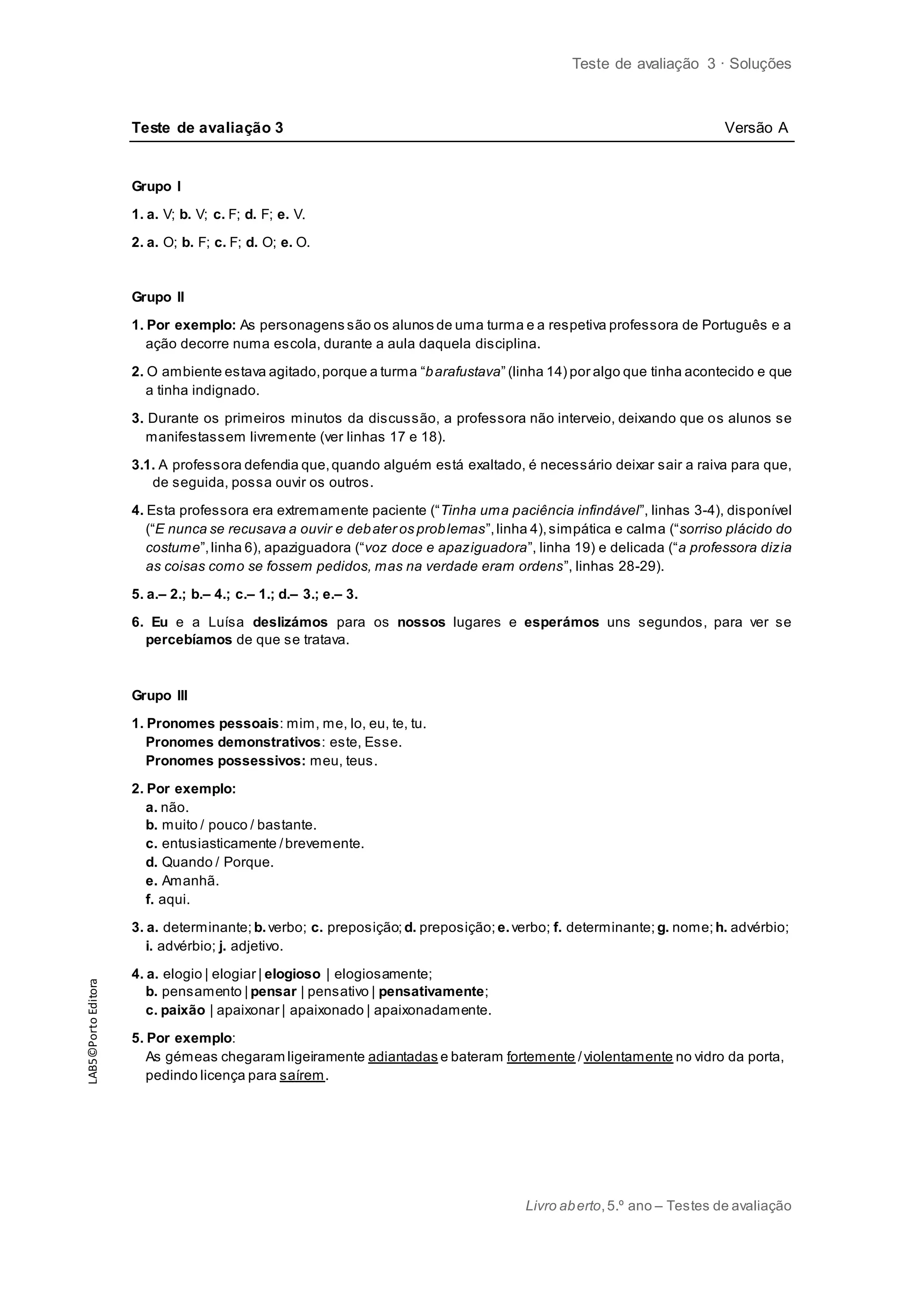 Este documento contém um teste de avaliação com três grupos de questões. O Grupo I contém questões de verdadeiro ou falso. O Grupo II contém questões sobre um texto sobre uma aula de português. O Grupo III contém exercícios gramaticais sobre pronomes e verbos.