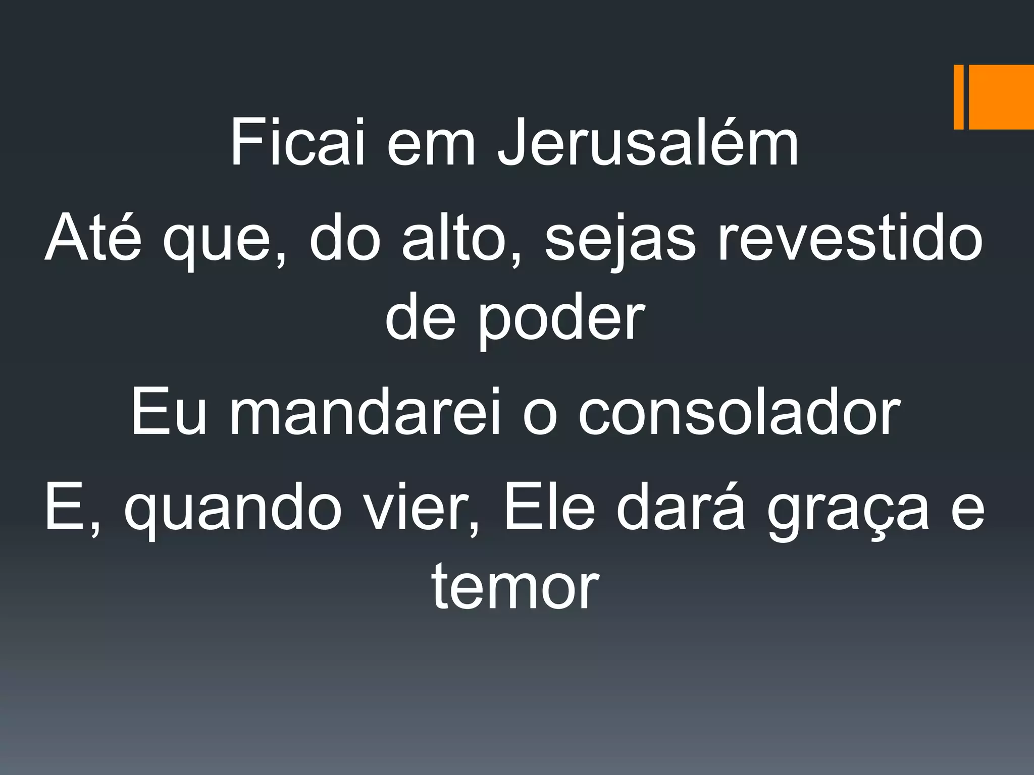 O documento fala sobre permanecer em Jerusalém até receber poder do alto e o consolador prometido. Alguns desistiram mas 120 ficaram e de repente ouviram um som e um vento soprando, simbolizando a vinda do Espírito Santo como fogo sobre cada um.