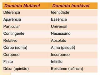 O documento discute como a filosofia, segundo Platão, realiza o propósito de tornar o homem feliz. Isso ocorre através da harmonia interna do indivíduo, equilibrando razão, irascibilidade e concupiscência, e também pela harmonia externa na sociedade.