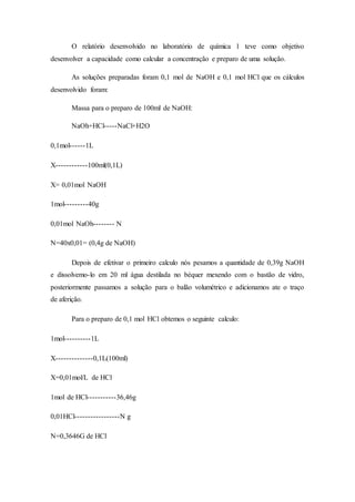 1) O relatório descreveu cálculos para preparar soluções de 0,1 mol de NaOH e HCl e testar sua neutralização usando fenolftaleína como indicador.