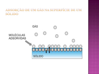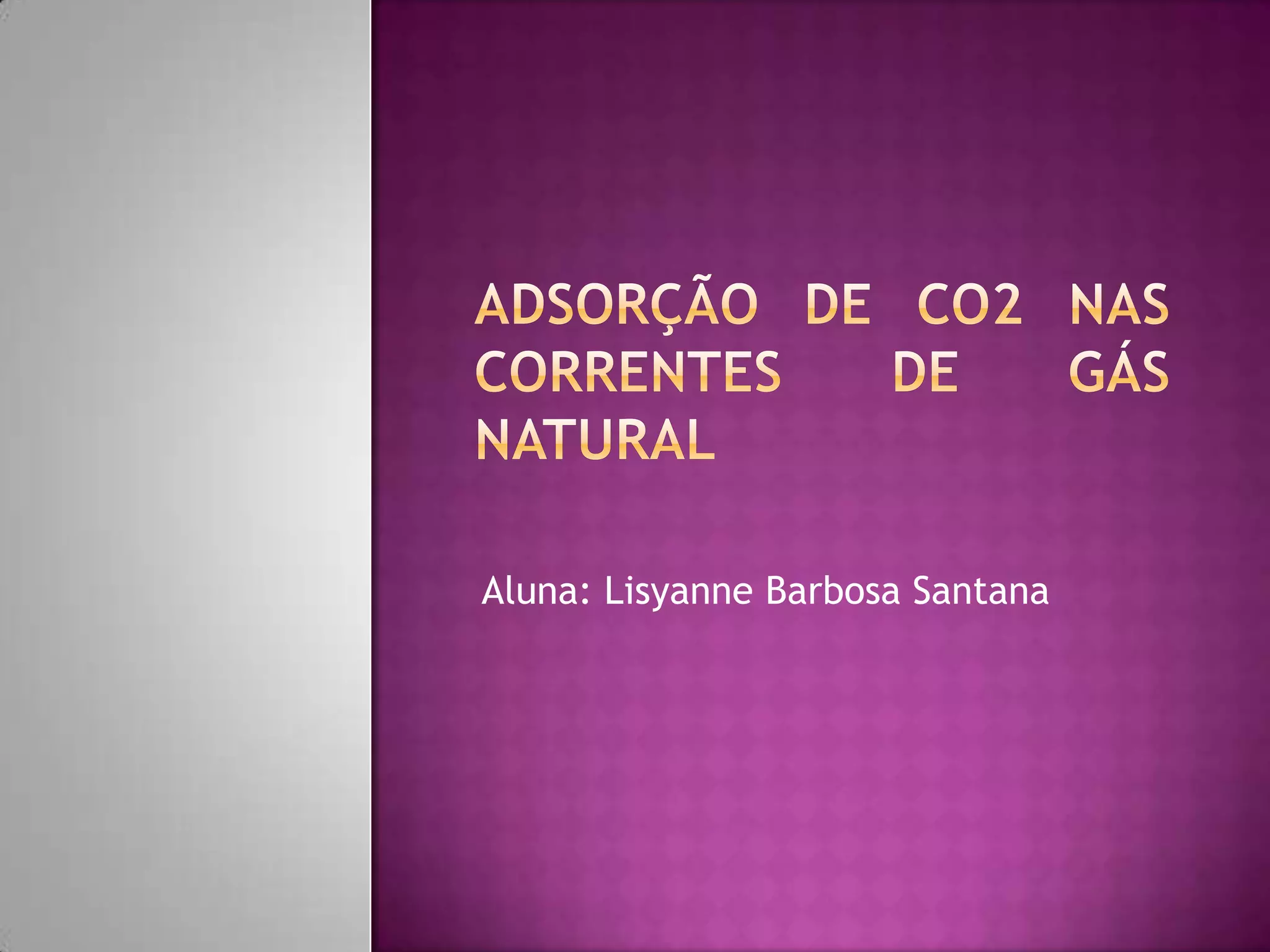 O documento discute o processo de adsorção para remover CO2 de gás natural usando zeólitas sintéticas, explicando como a adsorção funciona fixando moléculas no adsorvente e as vantagens desse processo.