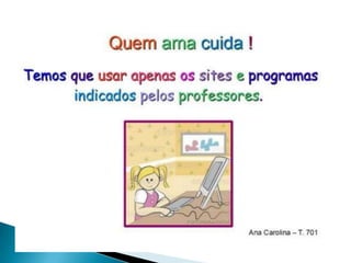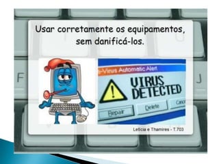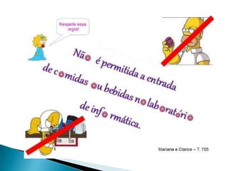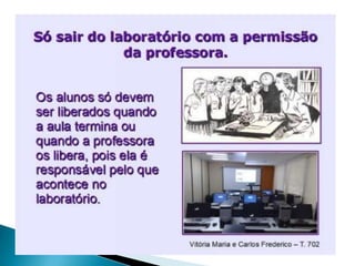 Lave as mãos antes de usar os computadores e tenha cuidado com os materiais do laboratório para não ficar doente. As regras vêm de um blog sobre o uso do laboratório de informática.
