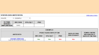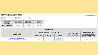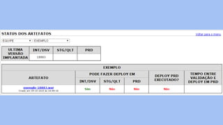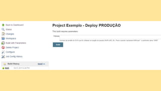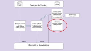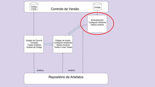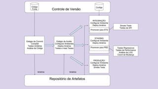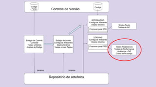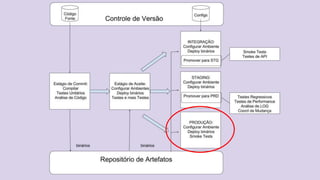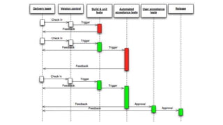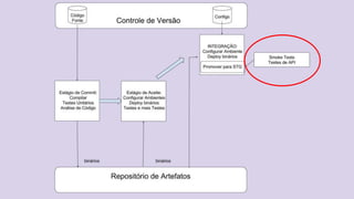 O documento discute o conceito de Continuous Delivery, que é um processo de entrega de software onde as mudanças são integradas, testadas e disponibilizadas de forma contínua e automatizada. Ele descreve os estágios de um pipeline de implantação contínua, incluindo commit, deploy em integração e staging, análise de logs, testes de performance e deploy em produção. O objetivo é permitir que as equipes entreguem software com mais frequência e confiabilidade.