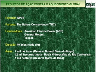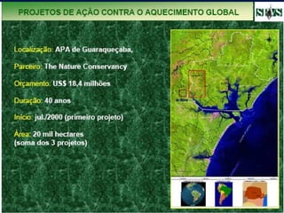 1) O documento discute pesquisas sobre seqüestro de carbono em florestas e solos no cerrado, e desenvolvimento de sistema de queima de gases para geração de energia.