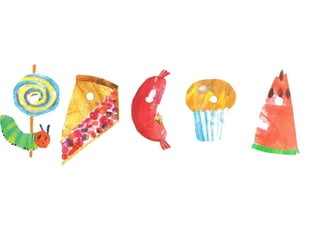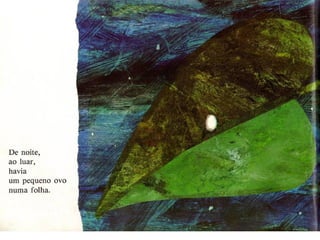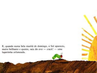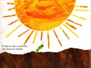Uma lagarta comeu maçãs, peras, ameixas, morangos e laranjas durante a semana, mas continuou com fome. Na sexta-feira à noite teve dores de barriga, mas no domingo comeu uma folha verde e se sentiu melhor, transformando-se em uma grande e gorda borboleta colorida.