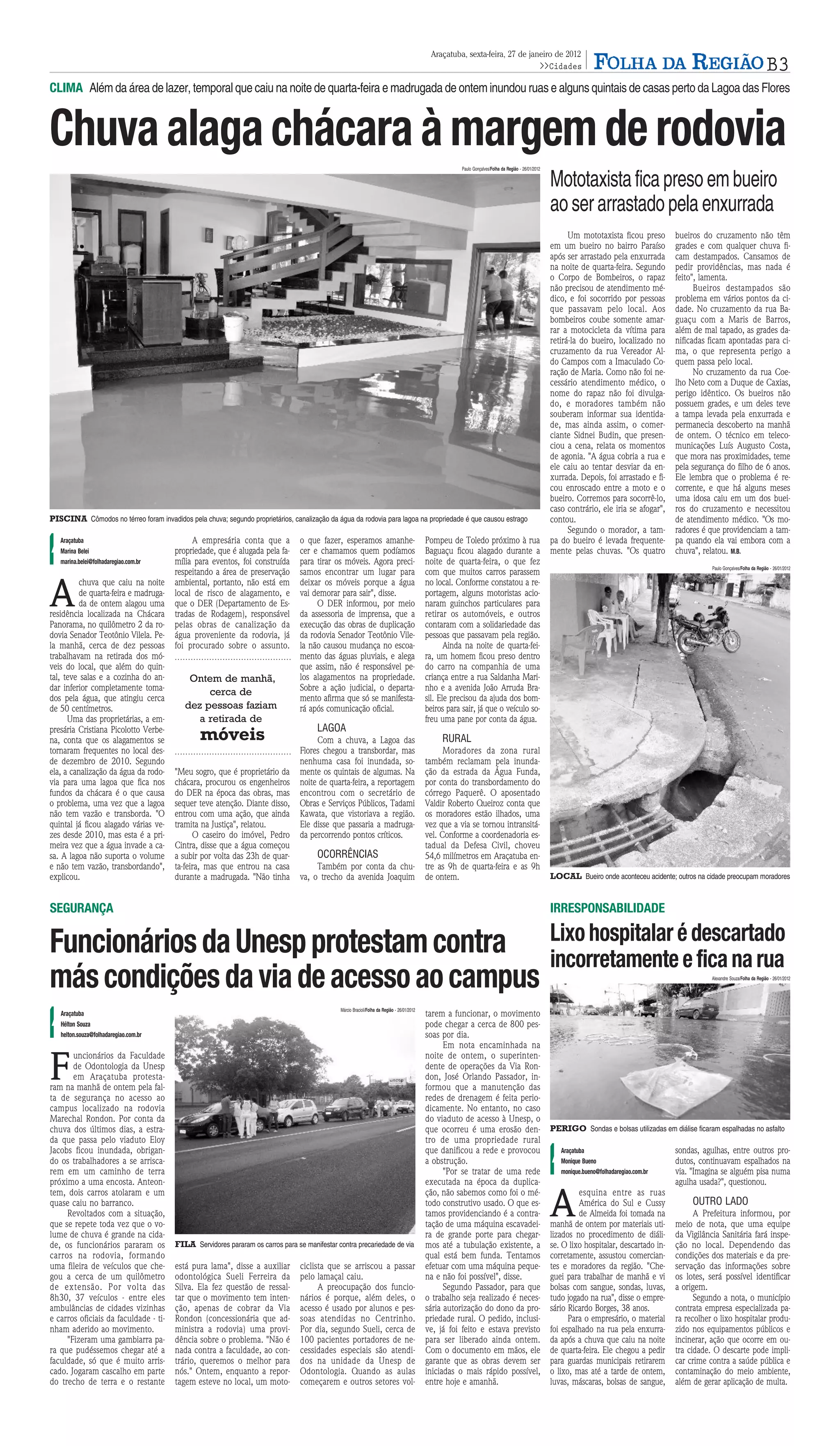 Uma forte chuva causou alagamentos em Araçatuba, inundando ruas, bueiros e uma residência. Um mototaxista ficou preso em um bueiro enquanto era arrastado pela enxurrada. Funcionários da Unesp protestaram devido à falta de segurança na estrada de acesso ao campus por conta dos alagamentos.