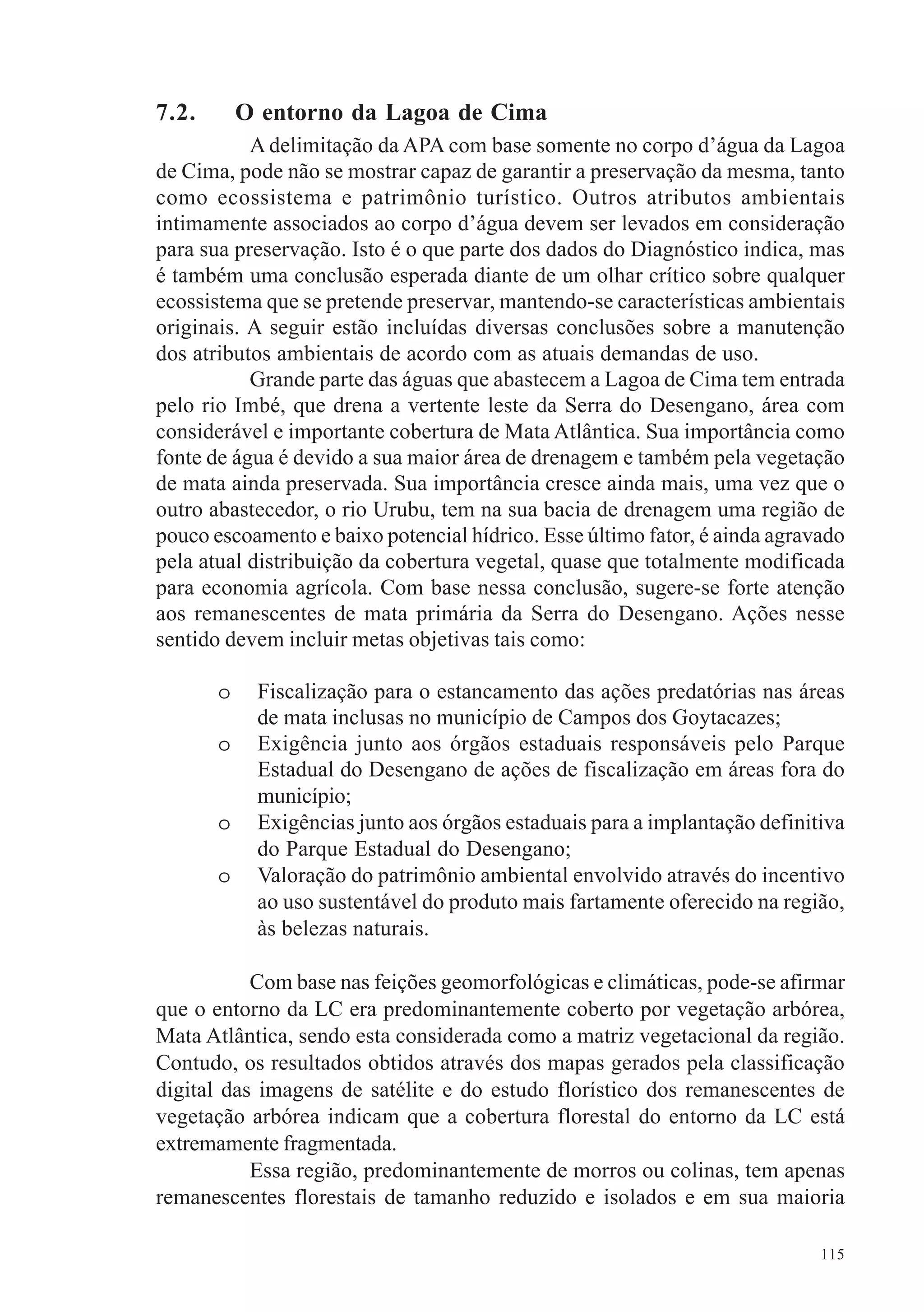 O documento discute a necessidade de proteger a Lagoa de Cima e seu entorno, incluindo matas, rios e áreas úmidas. Ele sugere ações como fiscalizar atividades predatórias, incentivar o reflorestamento com espécies nativas, recuperar áreas alagadas e melhorar a qualidade da água. Também enfatiza a importância de educar a comunidade local sobre a preservação ambiental e desenvolver atividades sustentáveis como pesca esportiva.
