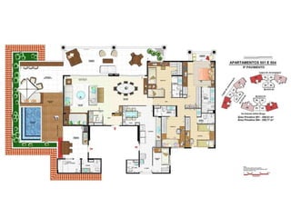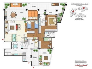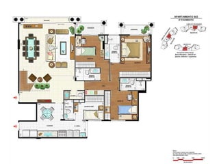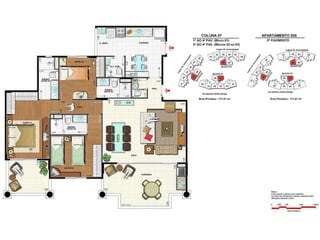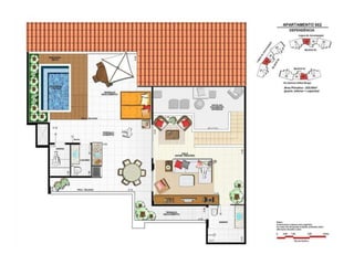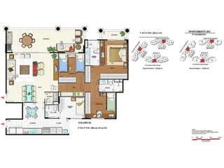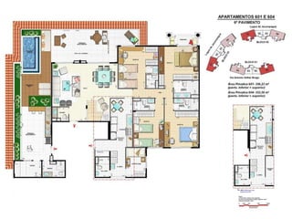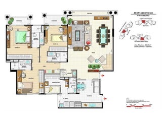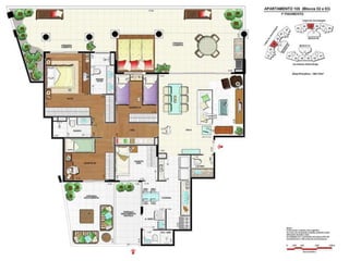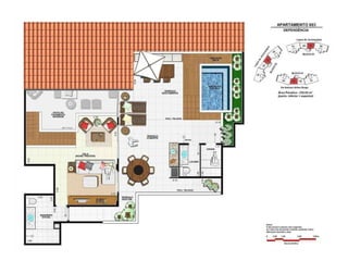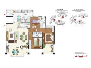 O documento apresenta imagens de perspectiva e fotos de diferentes áreas e instalações de um empreendimento residencial, incluindo fachada, piscina, jardim, espaços de lazer, apartamentos e coberturas.