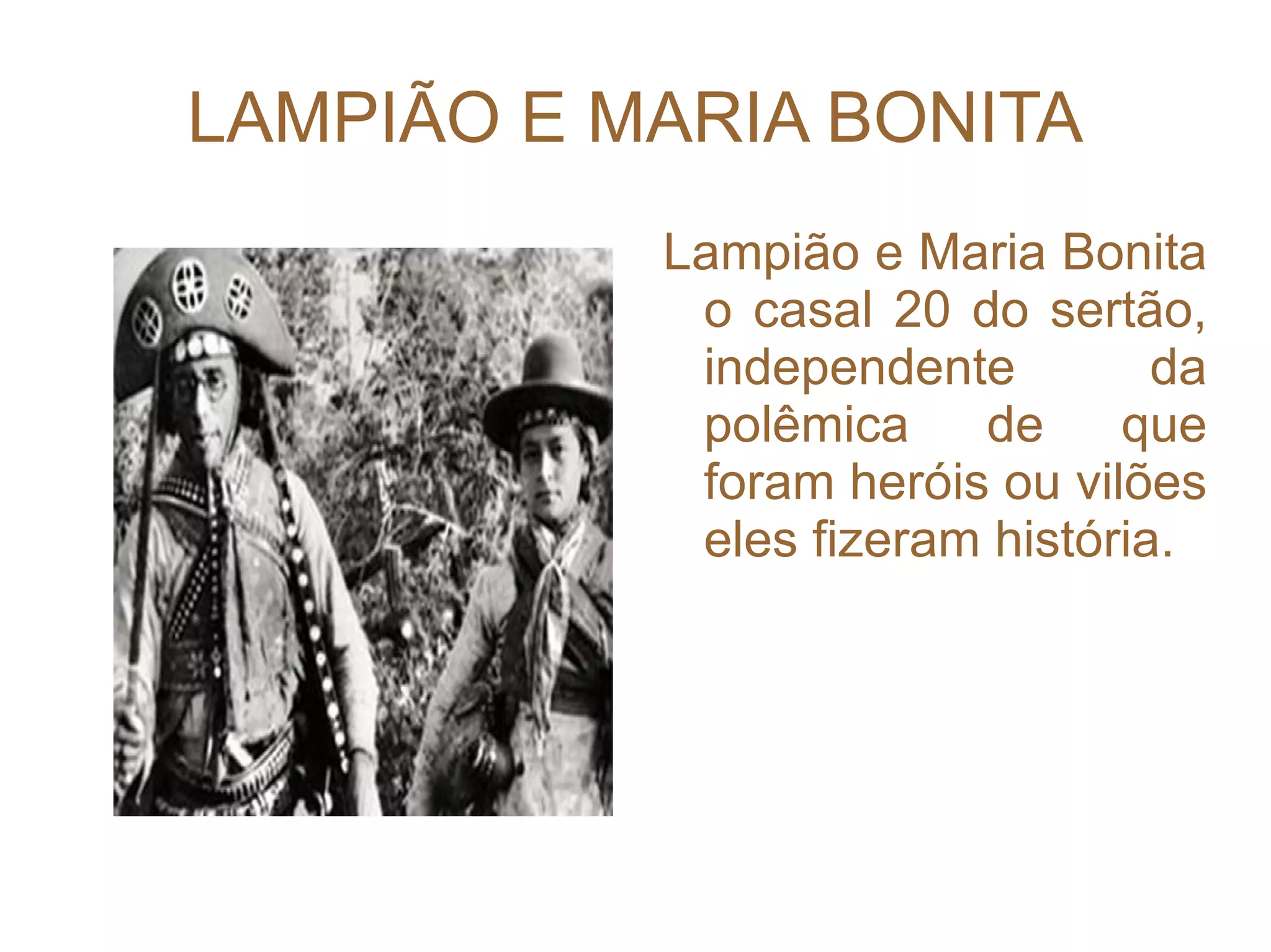 Lampião e Maria Bonita foram um casal famoso do sertão nordestino cujas ações, seja como heróis ou vilões, fizeram história. Seu bando, o cangaço, aterrorizou o nordeste com violência e injustiças até ser derrotado em 1938 no sítio Angicos, encerrando a era do cangaço na região.