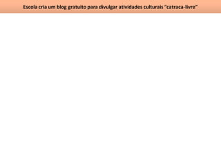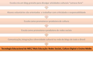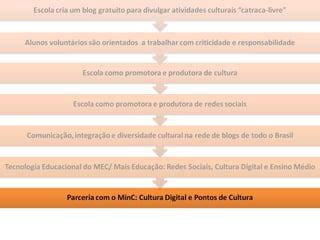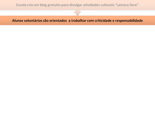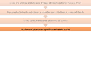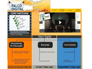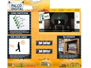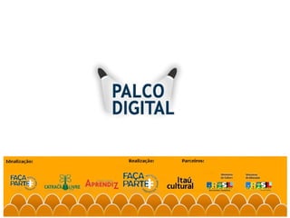 O documento descreve o Palco Digital, uma plataforma que usa a cidade como espaço educativo para formar uma rede social através da arte, cultura e conhecimento. Também menciona o Voluntariado Educativo e a Rede de Escolas Solidárias, além de apresentar brevemente a metodologia e experiência do jornalismo comunitário na escola Catraca.