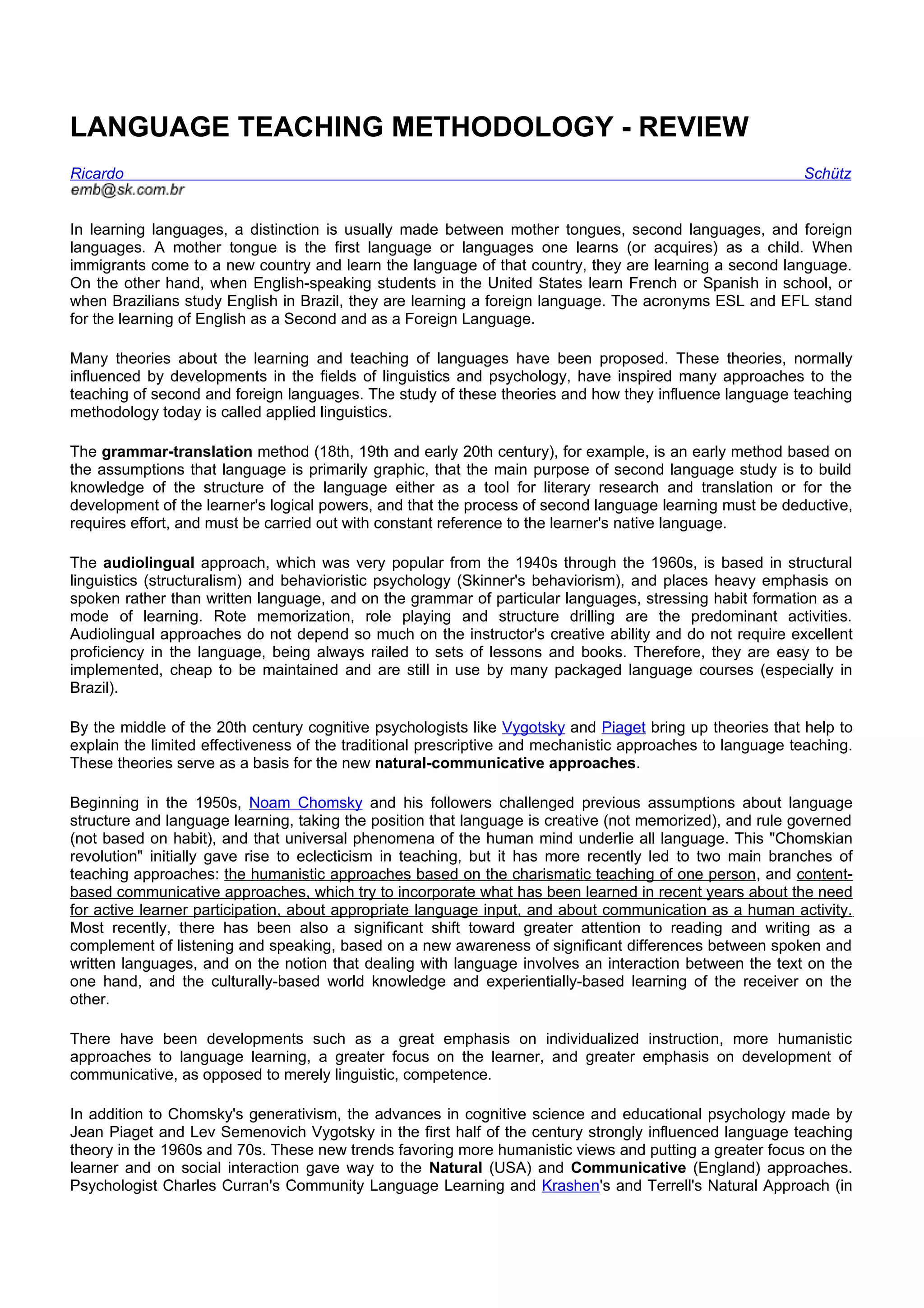 O documento discute a evolução das metodologias de ensino de idiomas ao longo do tempo. Inicialmente foram populares métodos como a tradução gramatical e o audiolingualismo. Posteriormente, teorias cognitivas como as de Piaget e Vygotsky levaram ao declínio desses métodos prescritivos e ao surgimento de abordagens mais comunicativas e naturalistas. As ideias de Chomsky também influenciaram o maior foco no aluno e na comunicação. Finalmente, Krashen desenvolveu a Abordagem Natural, integrando essas contribuições à ps