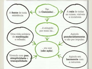 Este documento resume a vida e filosofia de Lao-Tsé, fundador do taoísmo no século VI a.C. na China. Lao-Tsé propôs uma teoria de governo justo baseada no conceito de "tao", ou caminho natural, pregando a não-ação e harmonia com a natureza em constante mudança. Seu livro Tao Te Ching tornou-se a base do taoísmo.